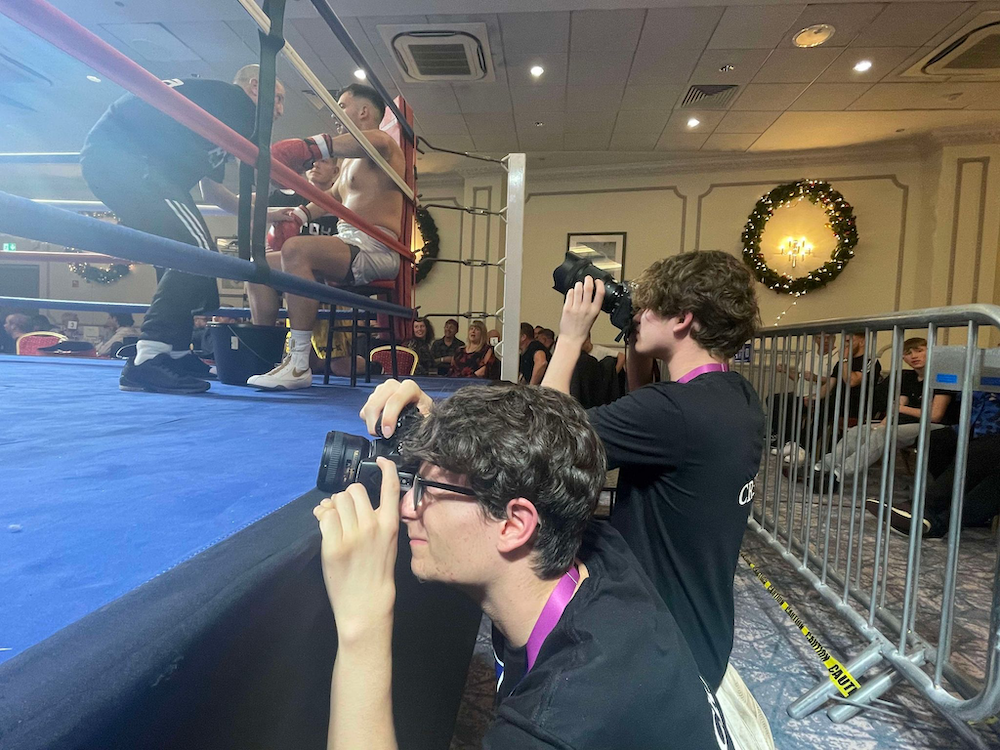 2 students taking pictures ringside of a boxing match