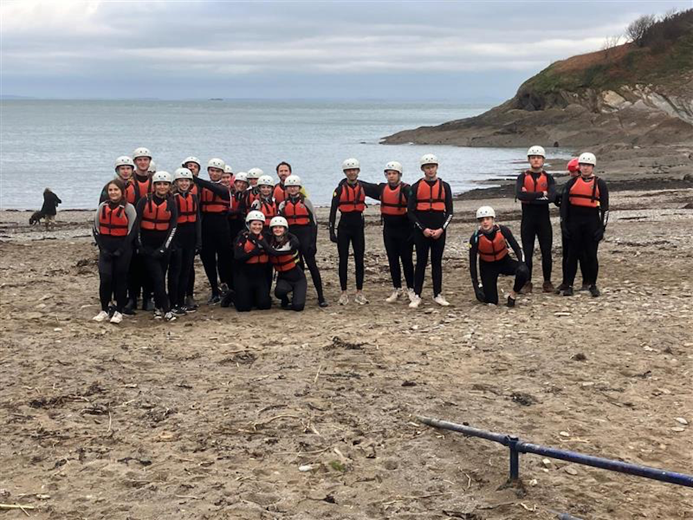 a group of students standingon a beach with helmets and life jackets on