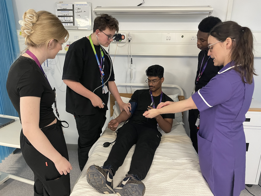 a students lies in a a hospital bed getting his blood pressure checked by other students