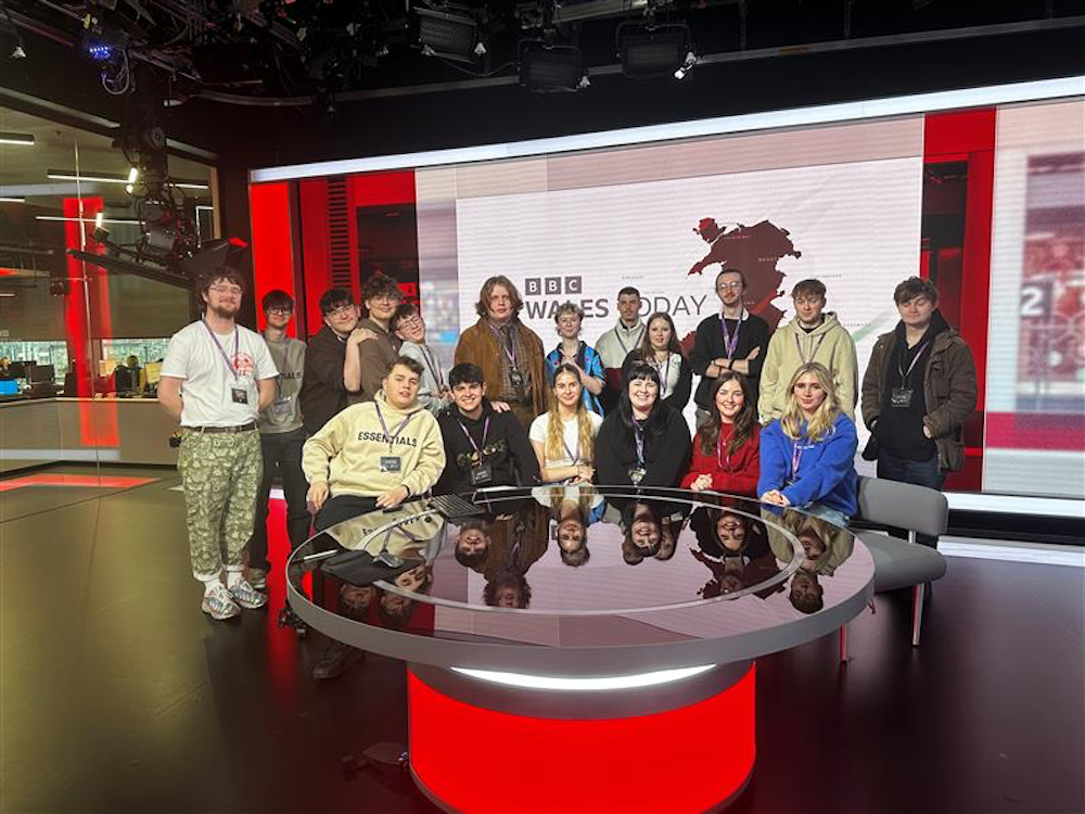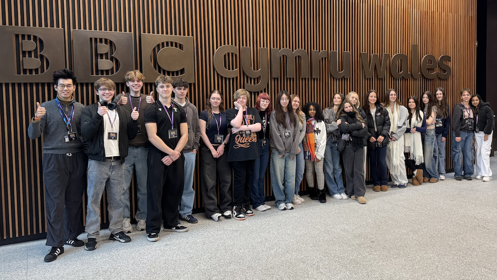 Students standing infront a a big BBC Cymru Wales sign at BBC Cymru Wales studios.