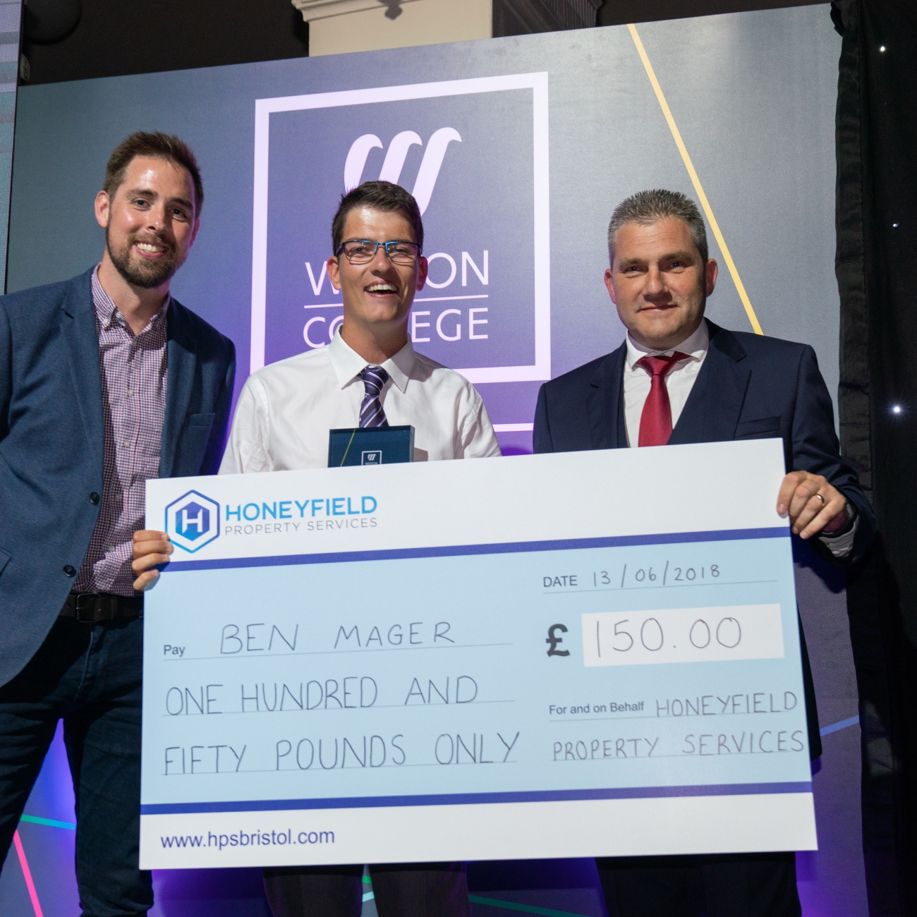 As part of his prize, Ben Mager received a cheque for £150 from event sponsors Honeyfield Property Services Ltd.